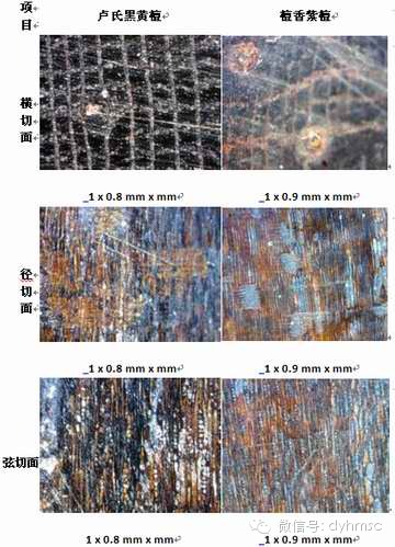 横切面对比说明:卢氏黑黄檀轴向薄壁组织,主为同心层型的细线(宽1~2细胞),且排列规整。檀香紫檀轴向薄壁组织,主为同心层式或略带波浪形的细线(宽1~2细胞),稀环管束状。